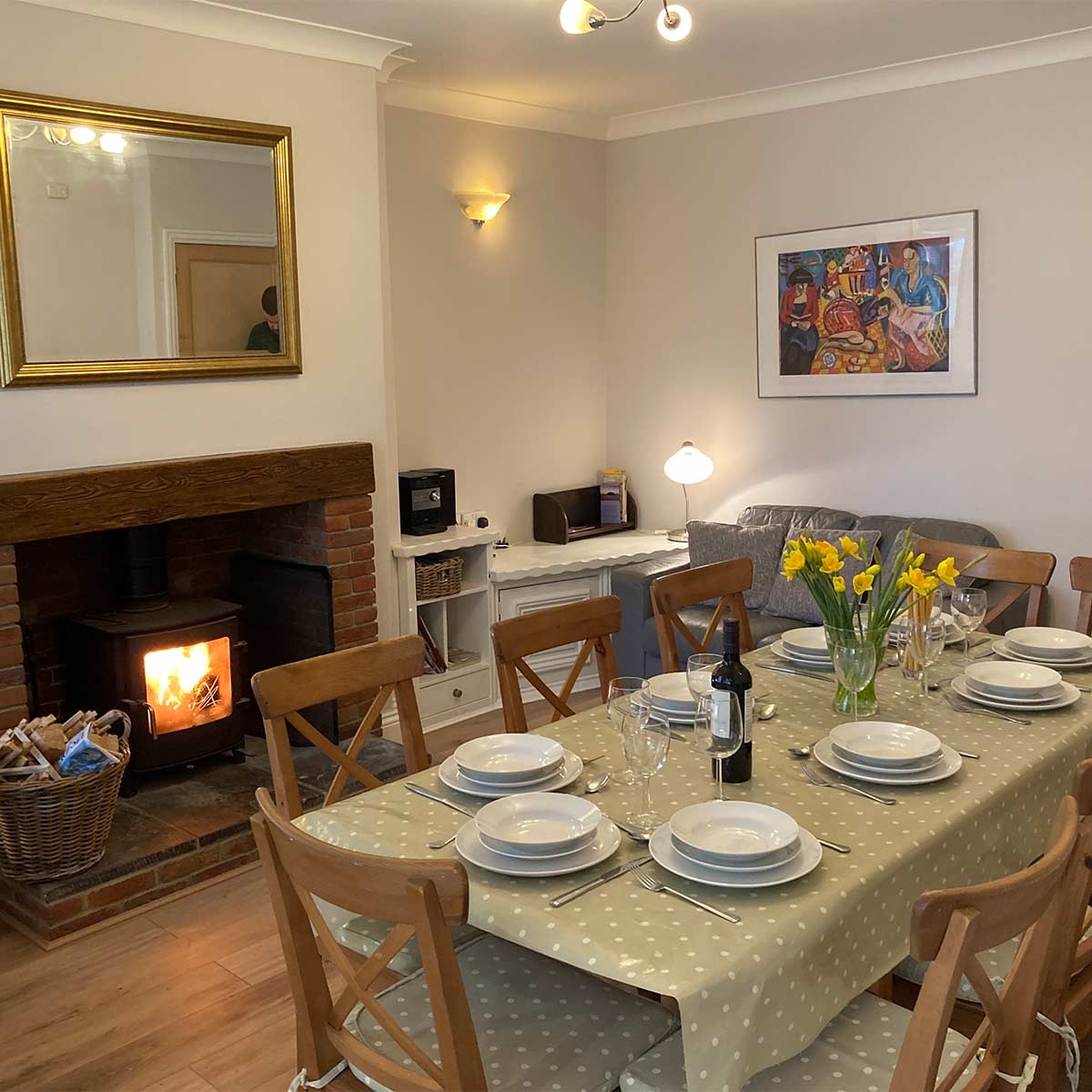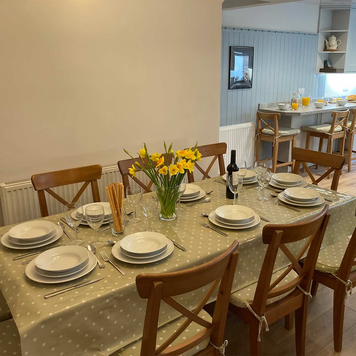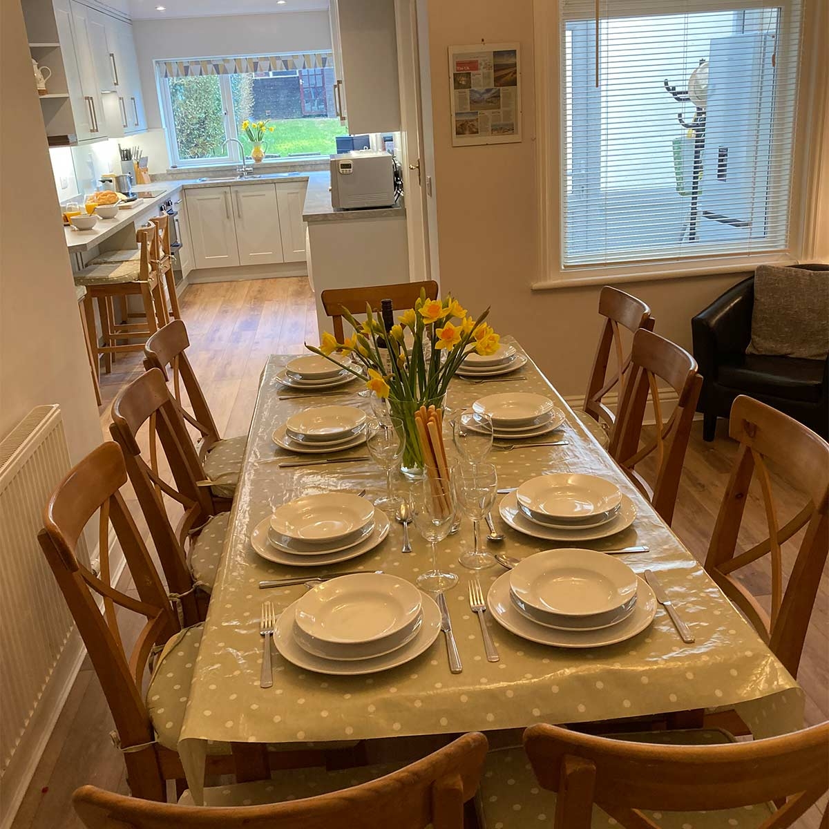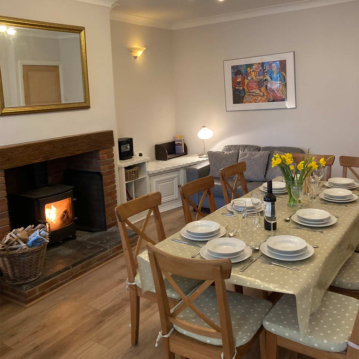 The dining room has been knocked through to create a spacious, airy, kitchen-diner. The dining room has a table seating up to 9 settings (extension panels to insert as required), and a radio/CD player and iPod dock. A range of board games are in the cupboard, and a wide selection of books are provided throughout the house.
