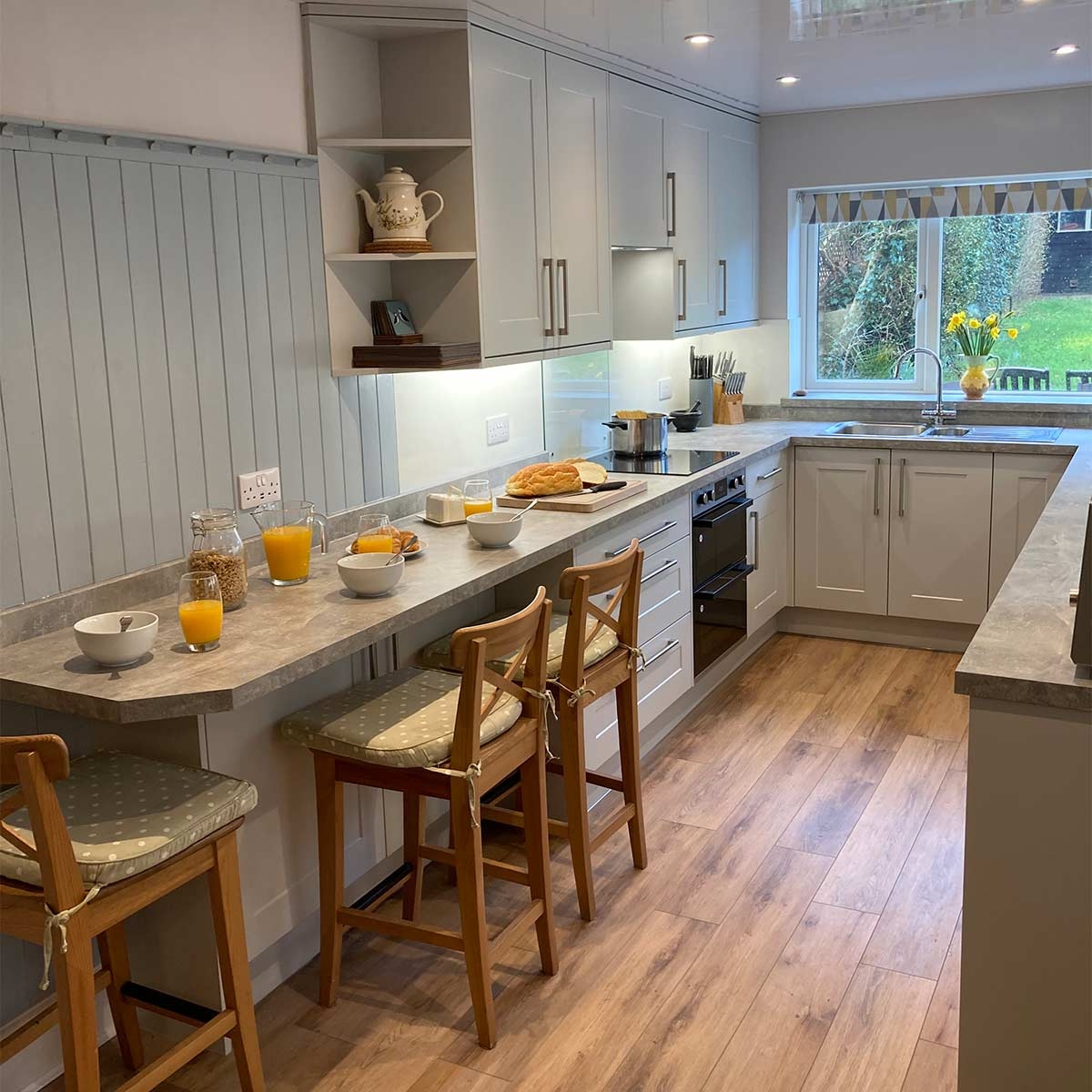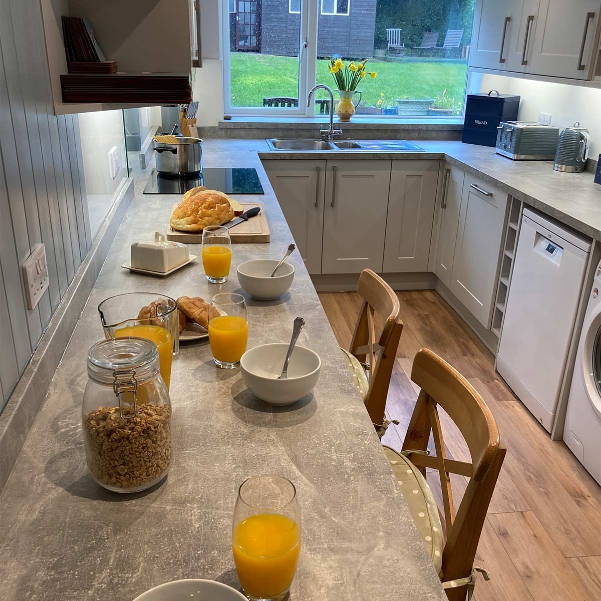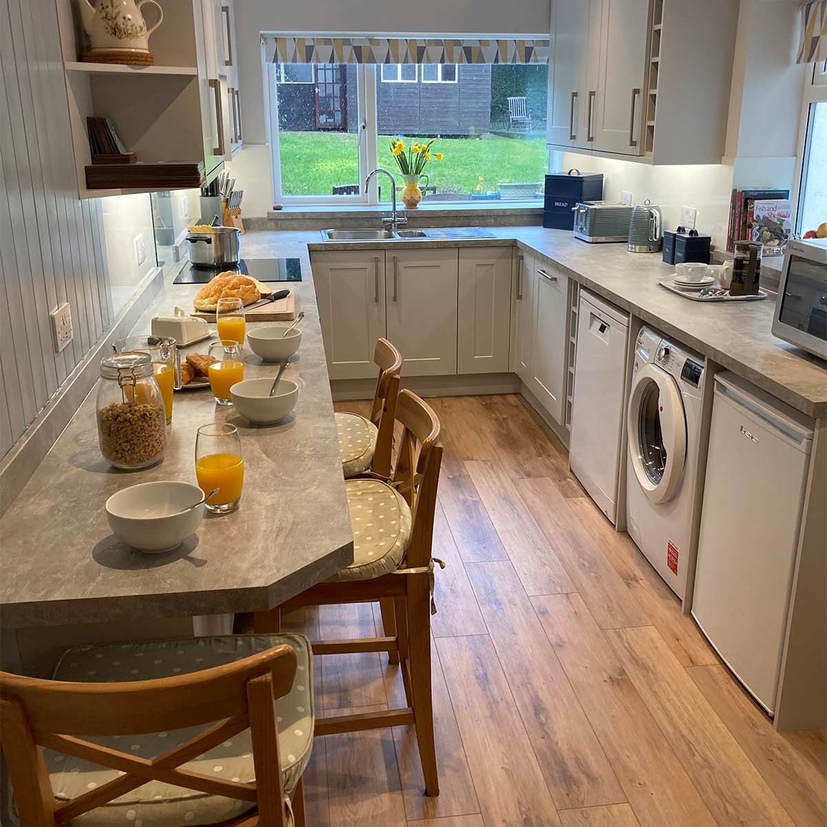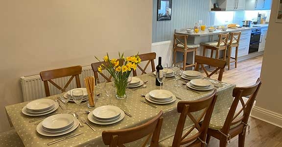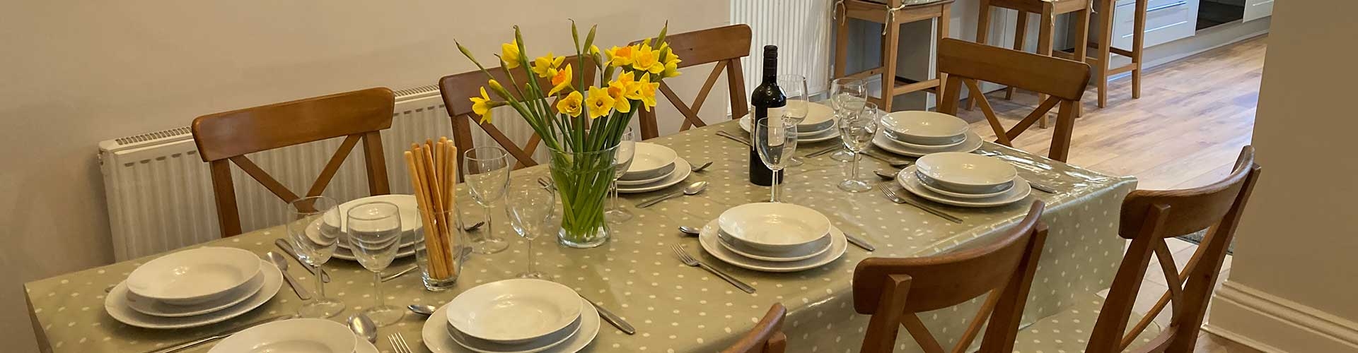 The dining room has been knocked through to create a spacious, airy, kitchen-diner. The dining room has a table seating up to 9 settings (extension panels to insert as required), and a radio/CD player and iPod dock. A range of board games are in the cupboard, and a wide selection of books are provided throughout the house.
